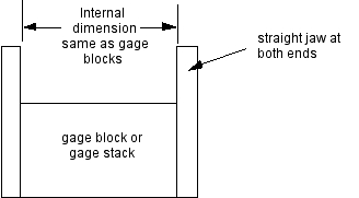 Straight jaws (sometimes referred to as outside extension jaws) are perhaps the most useful of the gage block accessories. These jaws allow gage blocks to be used to check INSIDE measuring instruments such as I.D. micrometers and calipers. These accessories extend the outside measuring surfaces of the gage blocks beyond the gage blocks themselves to form internal measuring surfaces with approximately the same tolerance as the gage blocks between the straight jaws. |