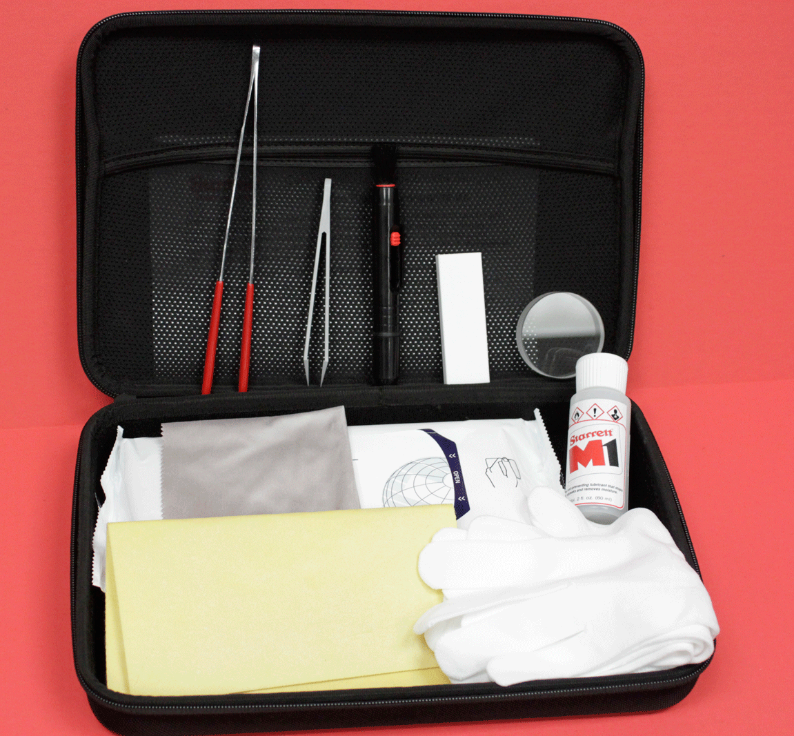 | The kit contains a resealable pack of 50 alcohol saturated wipers for cleaning your gage blocks along with two pair of nylon gloves and two sizes of forceps for handling gage blocks. An optical quality dust pen and a microfiber cloth are included for lint and dust removal. A gage block stone is included for burr removal as well as a 2" optical flat for checking block flatness. A chamois cloth and two ounce bottle of Starrett M1 oil are included to apply a protective coating to your blocks. All this in a zippered soft case for $350 MSRP! | |||||||||||||||||||